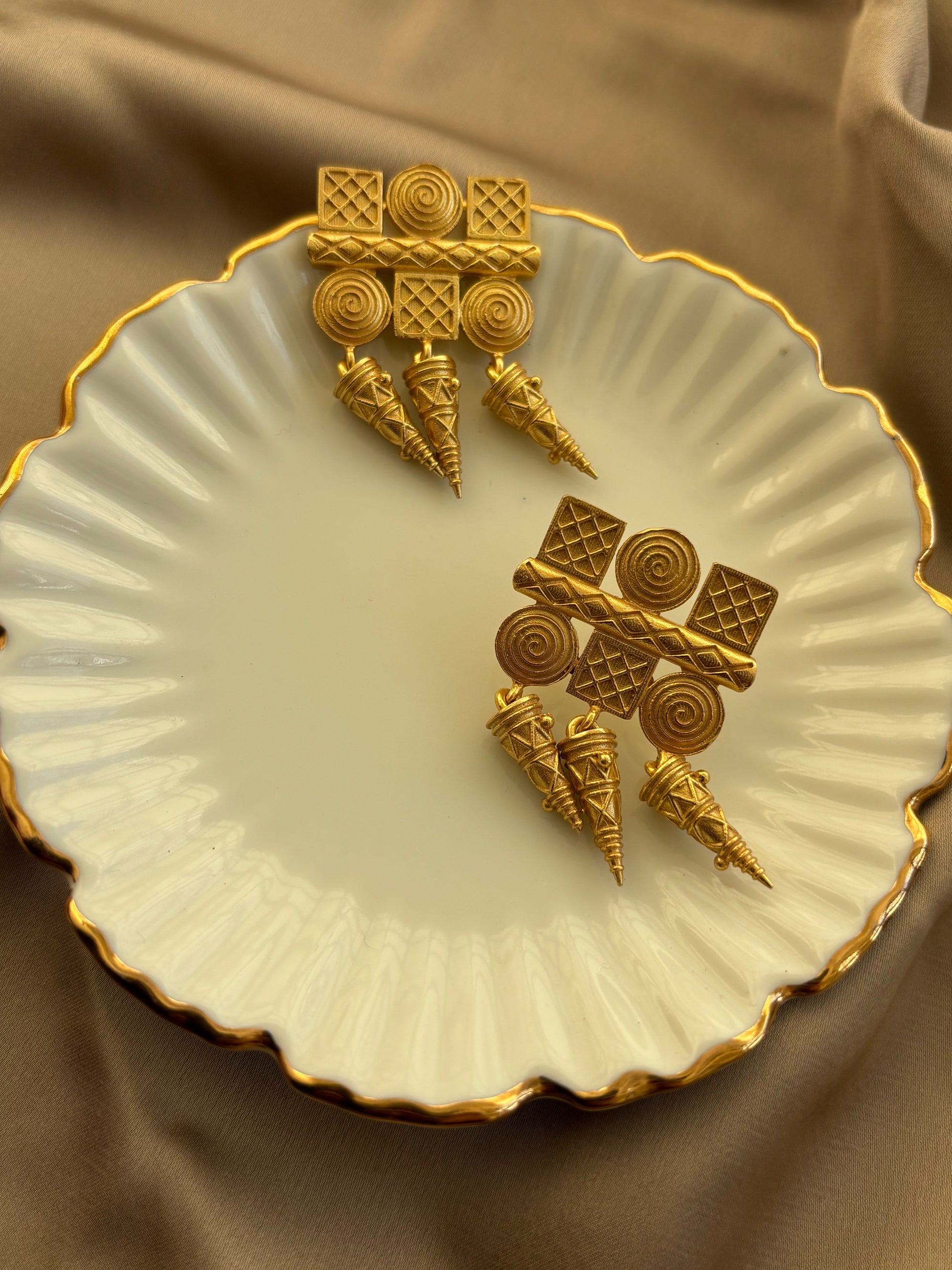 Inspired by symbols on adinkra cloth, a fabric printing of ghaana in West Africa, these earrings purely connect to the motifs and symbols of their art, which they put on fabrics.